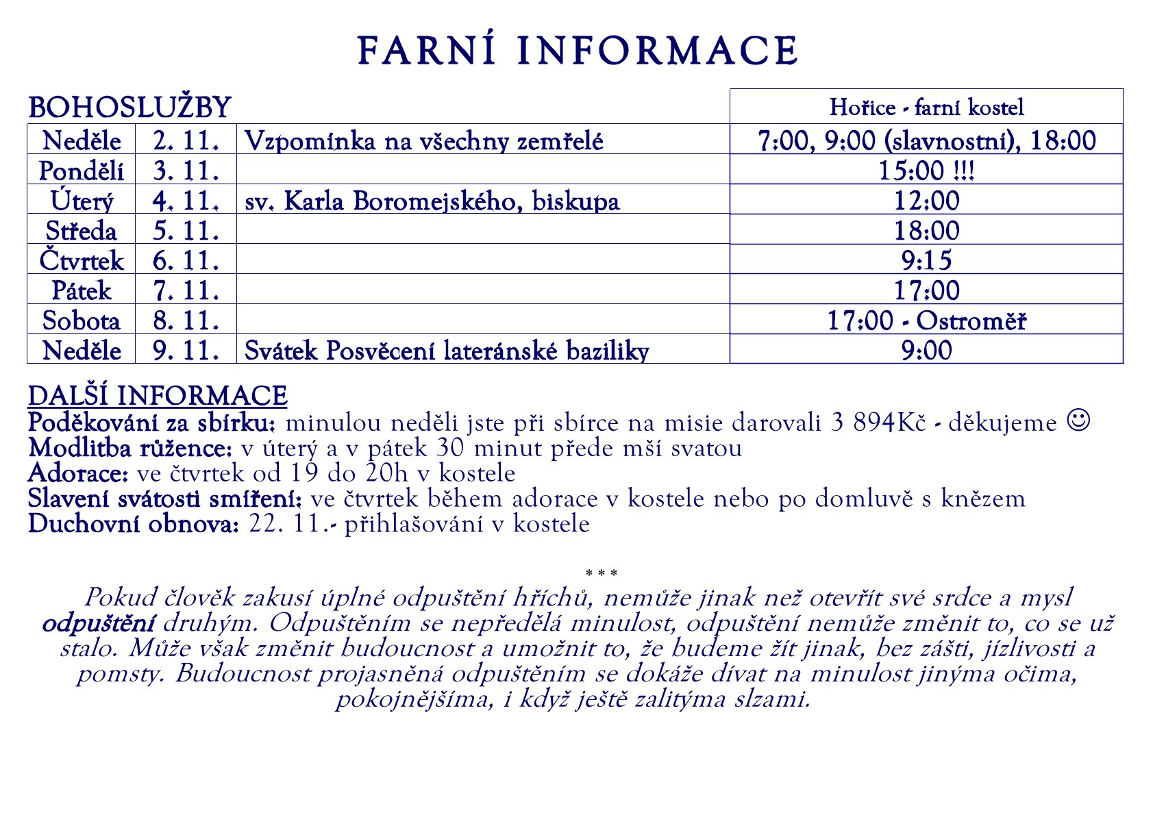 „Láska je shovívavá, láska je dobrosrdečná, nezávidí, láska se nevychloubá, nenadýmá, nedělá, co se nepatří, nemyslí jen a jen na sebe, nerozčiluje se, zapomíná, když jí někdo ublíží, ... (1 Kor 13, 4-5)