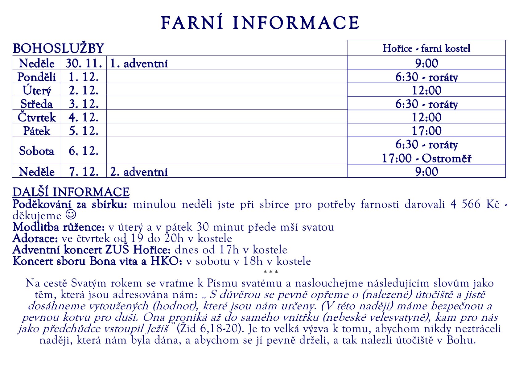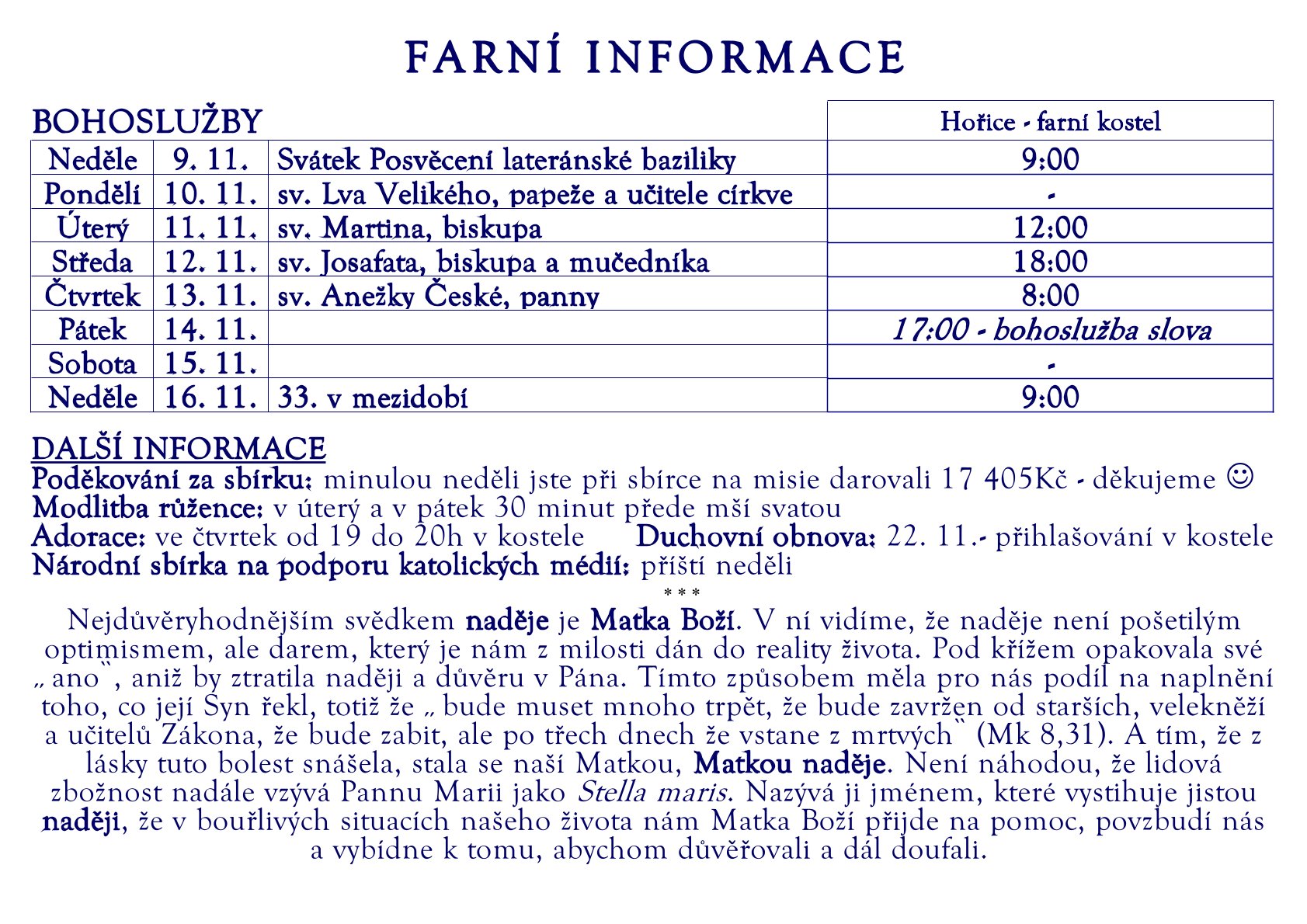 Modlitba růžence: v úterý a v pátek 30 minut před mší svatou